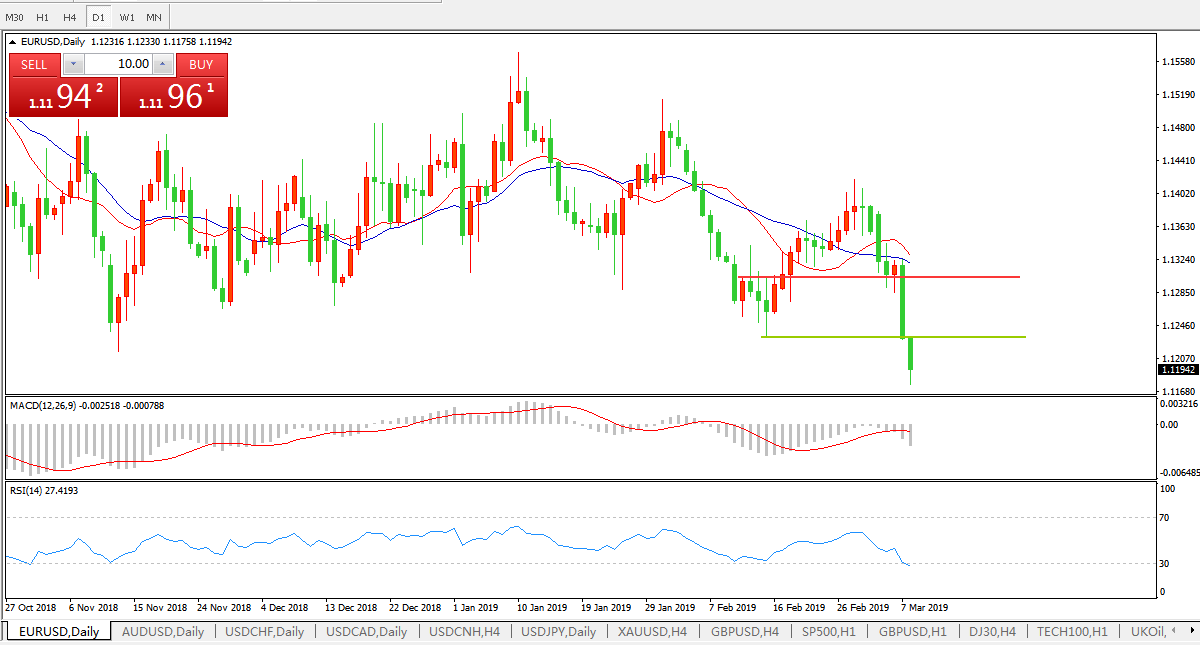 基本面分析:欧洲央行行长德拉基宣布下调经济预测,同时推出新一轮刺激措施以促进经济增长。这是欧洲央行启动量化宽松以来下调预测幅度最大的一次。德拉吉预计今年欧元区经济增长1.1%,比三个月前的预测下调0.6个百分点。他表示,通过实施向银行提供新的贷款、承诺将利率保持在纪录低点更长时间等一揽子方案,央行有意扩大现有的刺激举措。欧元兑美元跌至1.11765美元,为2017年中以来最低。欧元兑美元创下自2018614日以来的最大单日跌幅,当时欧洲央行将加息指引推迟到2019年夏季。分析师称,未来几周欧元兑美元面临跌至1.10的风险。