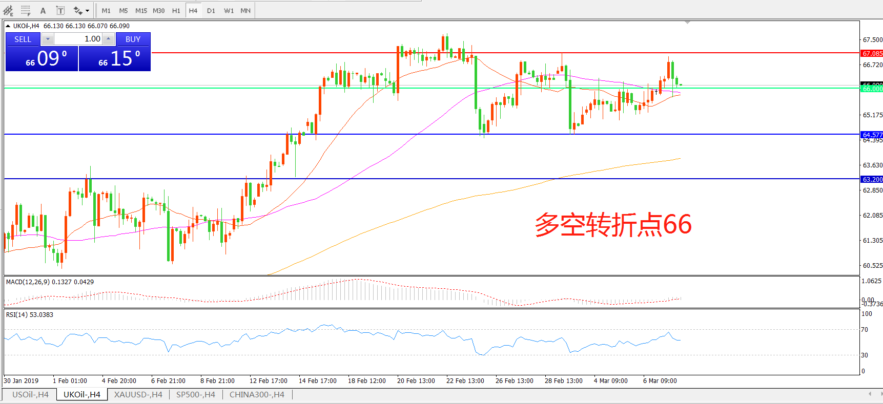 4小时图看,油价触及64.5附近出现反弹,触及67美金后出现回落,整体呈现窄幅震荡走势,短期均线有上穿形成金叉迹象,MACD红柱增加,日内有出现反弹可能。