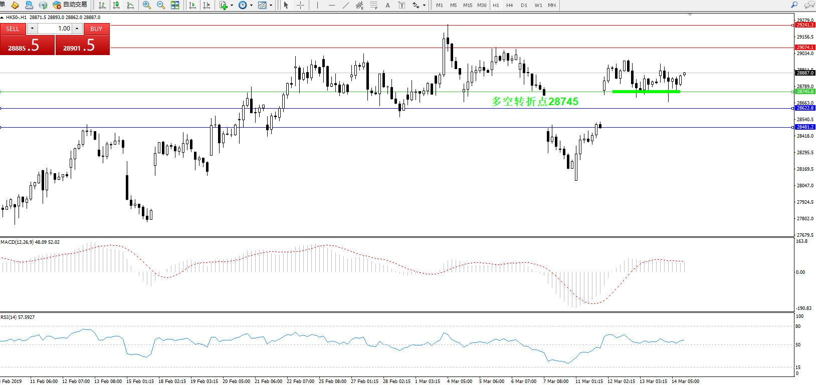 恒指HK50 ——1小时K线图显示: