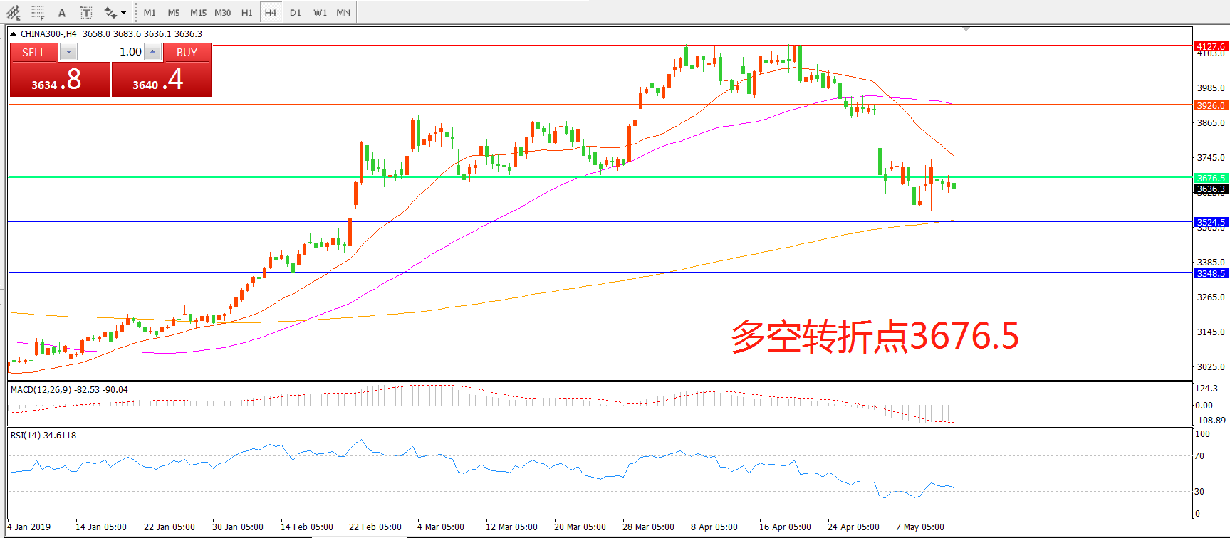 4小时图看,沪深300指数在连续下行后企稳,整体维持在3676.5附近小幅震荡200均线成为短线支撑,短期均线依然向下,MACD绿柱增加,RSI指标拐头,日内震荡下行概率较大