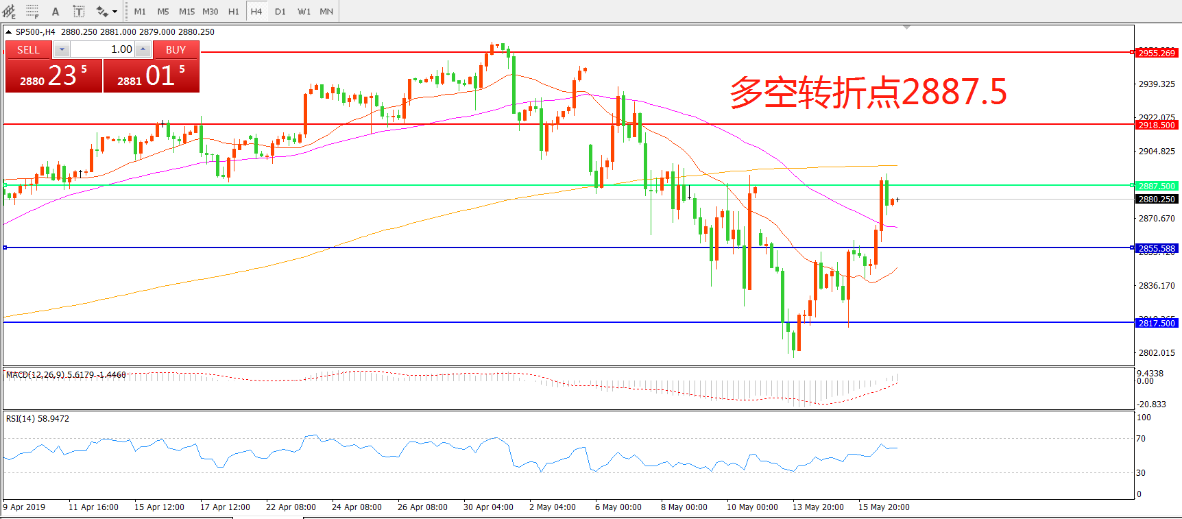 4小时图看,标普500阳线连续拉升,短期走势偏强,短期均线被突破形成支撑,200均线成为上方阻力,但 MACD绿柱缩短,红柱增加,RSI指标拐头走平,日内重点关注2887.5一线得失。