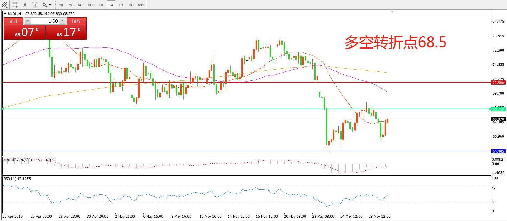 交易策略: 在68.50之下看跌,目标66.00   64.50