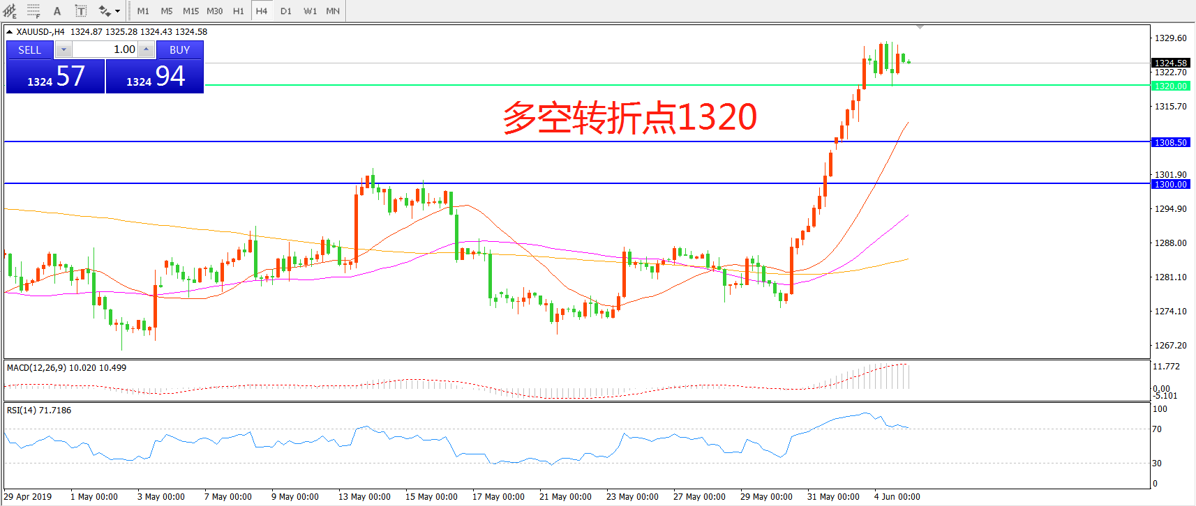 6月4日周二开始,美联储主席在致辞时表示,美联储将采取恰当措施维持经济持续扩张,正在密切关注贸易谈判和其他事件对美国经济前景的影响,此番言论被解读为暗示降息的可能性。现货黄金在创下逾三个月高位后小幅回落,整体表现依然强势。美国在多条战线卷入贸易摩擦,导致投资者避险情绪高涨,并引发对经济衰退的担忧,金价涨势料将持续。晚间20:15将有”小非农“之称的ADP数据公布,重点关注。