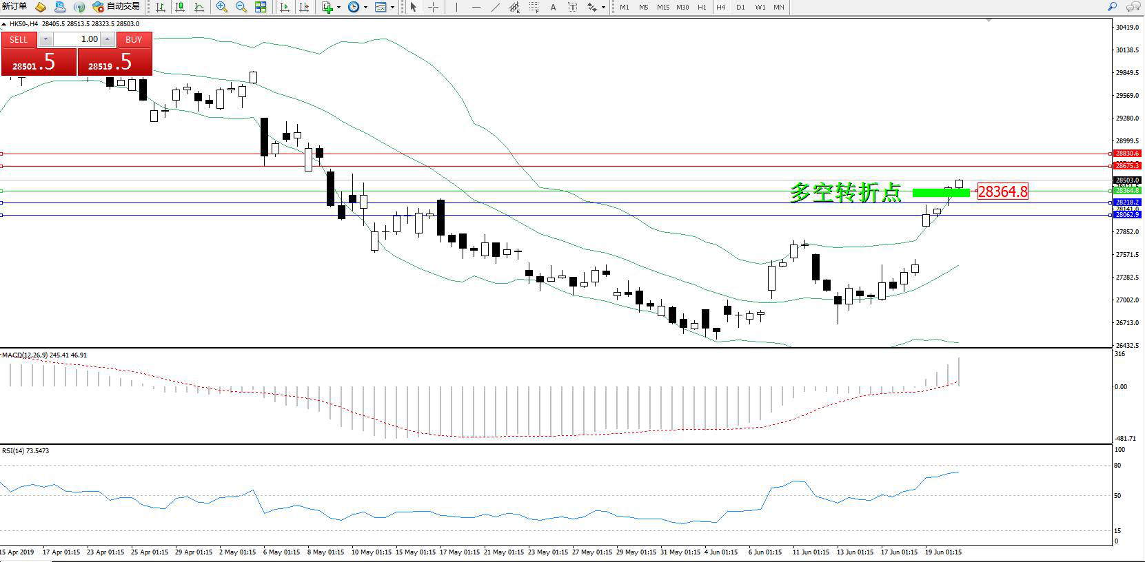 恒指HK50 ——4小时K线图显示: