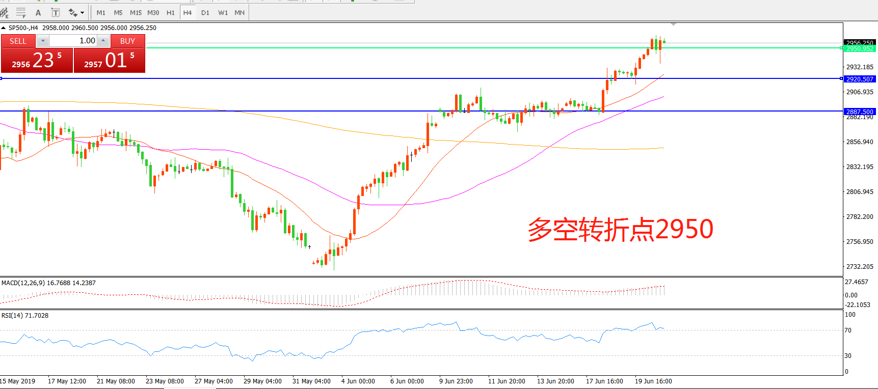 4小时图看,标普高位震荡后上阳拉升,上升趋势明显,均线系统呈多头排列,MACD红柱减少,RSI指标向上,日内延续上行概率较大。
