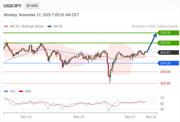 在 154.30 之上,看涨,目标价位为 155.00 ,然后为 155.35 。