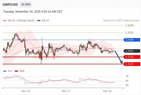 在 1.3190 之下,看跌,目标价位为 1.3130 ,然后为 1.3105 。