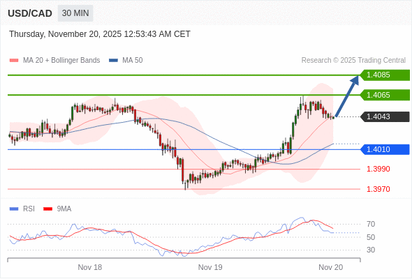在 1.4010 之上,看涨,目标价位为 1.4065 ,然后为 1.4085 。