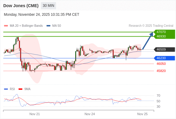 在 46230 之上,看涨,目标价位为 46930 ,然后为 47070 。