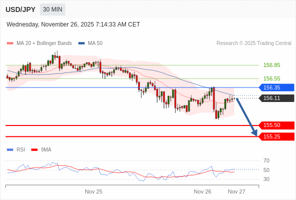 在 156.35 之下,看跌,目标价位为 155.50 ,然后为 155.25 。