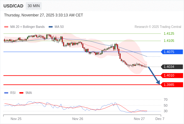 在 1.4075 之下,看跌,目标价位为 1.4010 ,然后为 1.3985 。