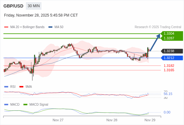 英镑/美元 当日内 : 看涨,当 1.3212 为支撑位。
