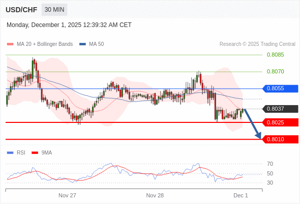 在 0.8055 之下,看跌,目标价位为 0.8025 ,然后为 0.8010 。