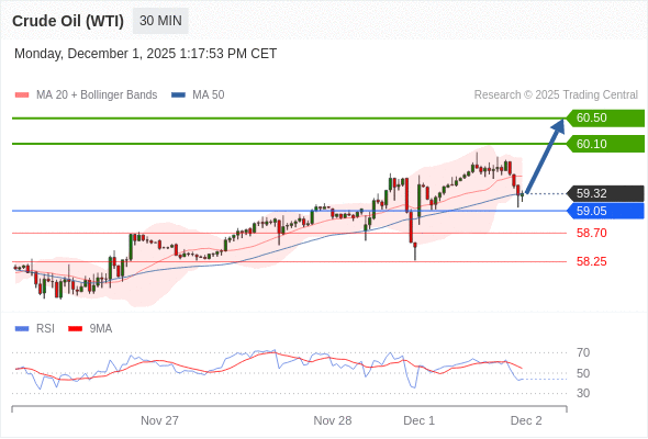 在 59.05 之上,看涨,目标价位为 60.10 ,然后为 60.50 。