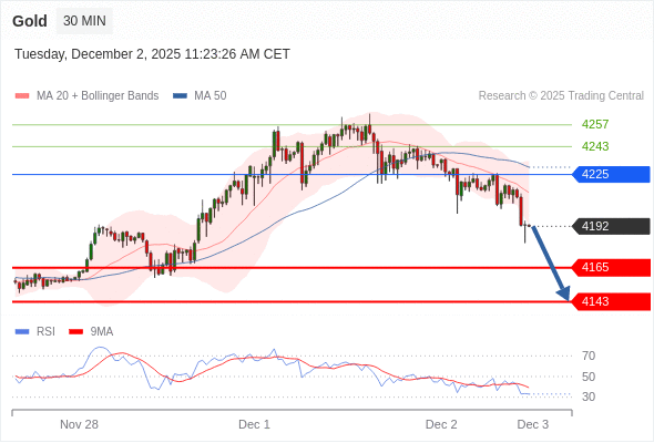 在 4225 之下,看跌,目标价位为 4165 ,然后为 4143 。