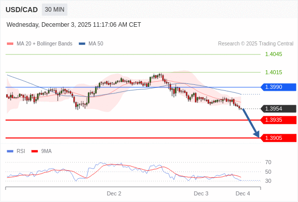 在 1.3990 之下,看跌,目标价位为 1.3935 ,然后为 1.3905 。