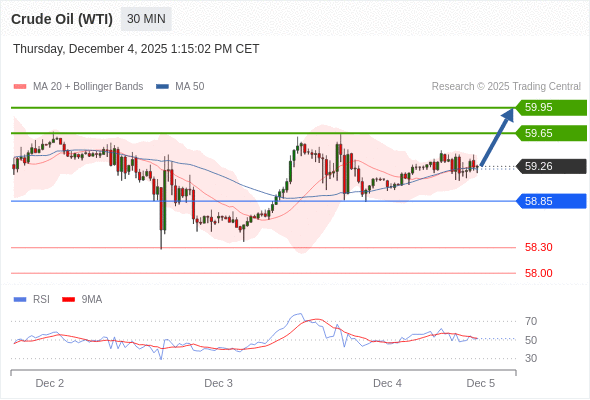 在 58.85 之上,看涨,目标价位为 59.65 ,然后为 59.95 。
