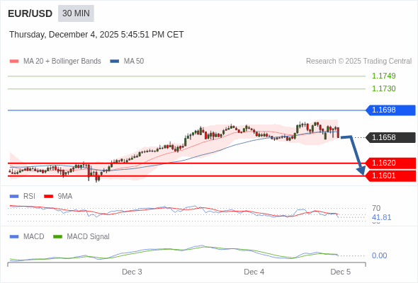 欧元/美元 当日内 : 看跌,当 1.1698 为阻力位。