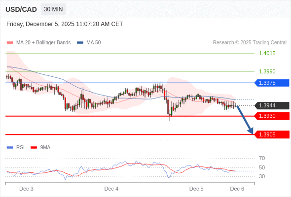 在 1.3975 之下,看跌,目标价位为 1.3930 ,然后为 1.3905 。