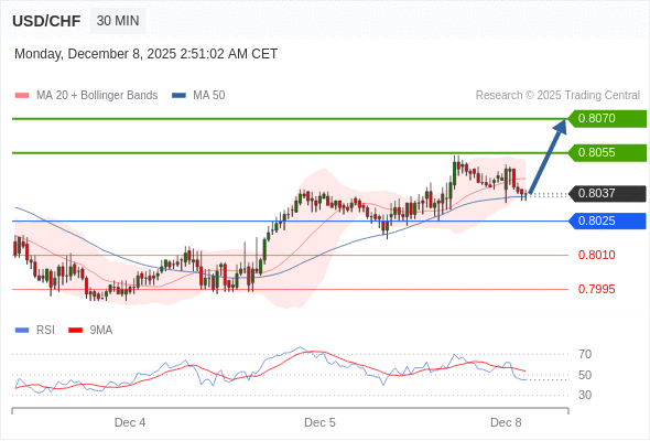 在 0.8025 之上,看涨,目标价位为 0.8055 ,然后为 0.8070 。