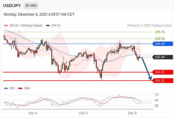 交易策略: 在 155.40 之下,看跌,目标价位为 154.55 ,然后为 154.30 。