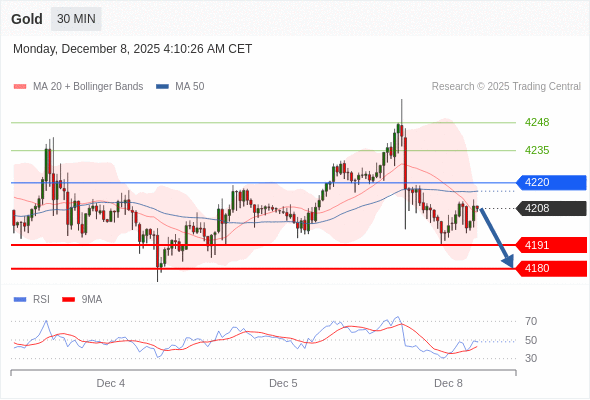 在 4220 之下,看跌,目标价位为 4191 ,然后为 4180 。