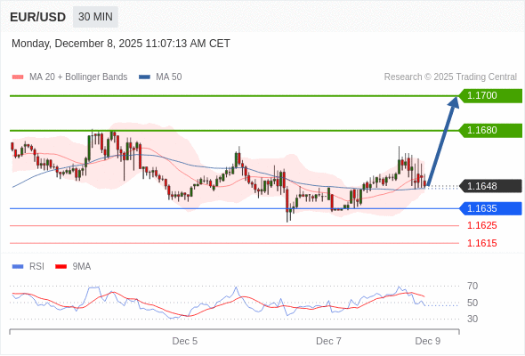 在 1.1635 之上,看涨,目标价位为 1.1680 ,然后为 1.1700 。