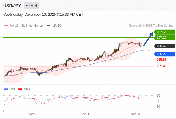 在 156.20 之上,看涨,目标价位为 157.20 ,然后为 157.55 。