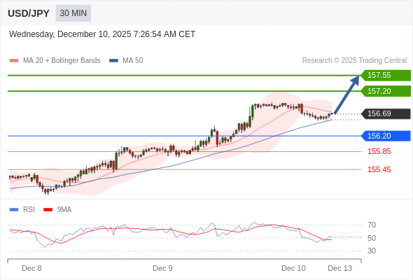 在 156.20 之上,看涨,目标价位为 157.20 ,然后为 157.55 。