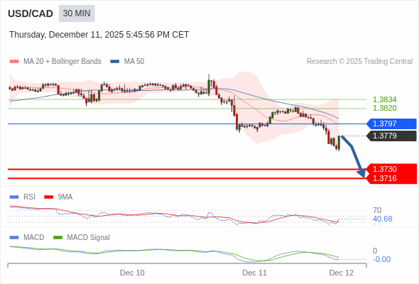 美元/加元 当日内 : 看跌,在 1.3797 之下。