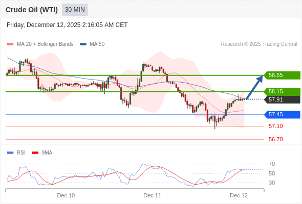 在 57.45 之上,看涨,目标价位为 58.15 ,然后为 58.65 。