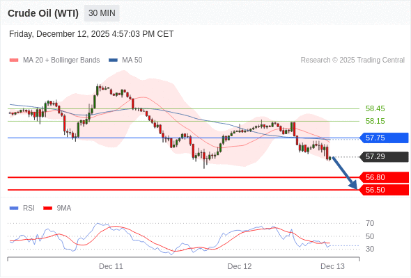 交易策略: 在 57.75 之下,看跌,目标价位为 56.80 ,然后为 56.50 。
