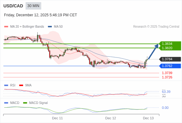 美元/加元 当日内 : 看涨,当 1.3762 为支撑位。