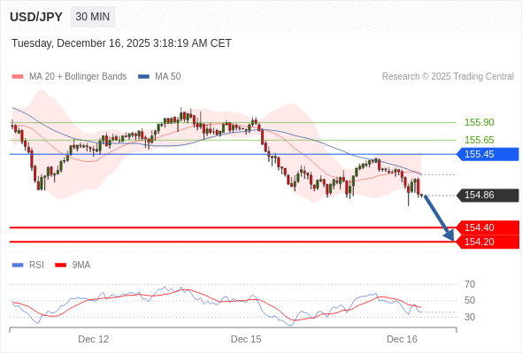 在 155.45 之下,看跌,目标价位为 154.40 ,然后为 154.20 。