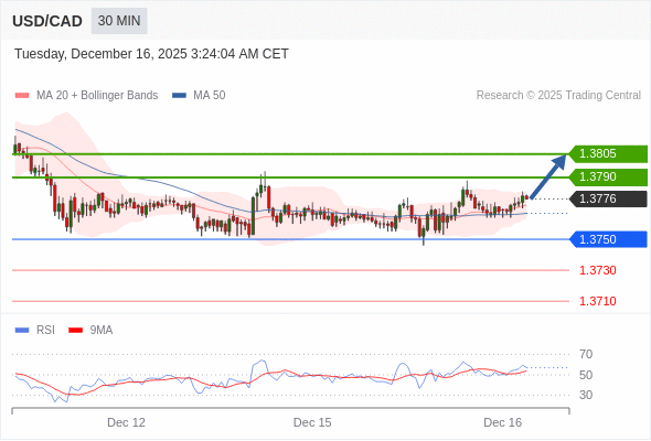 在 1.3750 之上,看涨,目标价位为 1.3790 ,然后为 1.3805 。