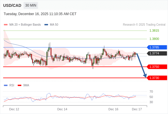 在 1.3785 之下,看跌,目标价位为 1.3750 ,然后为 1.3730 。