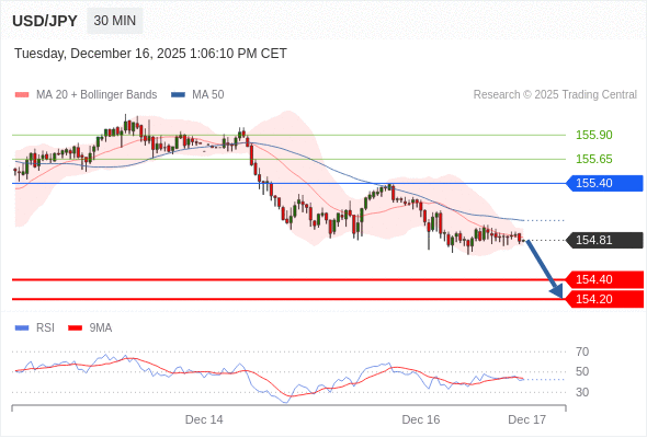 在 155.40 之下,看跌,目标价位为 154.40 ,然后为 154.20 。