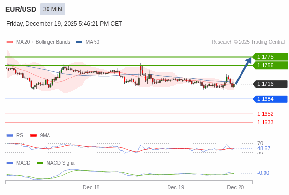 欧元/美元 当日内 : 有上涨的可能,目标价位定在 1.1775 。
