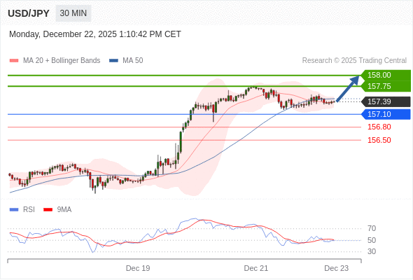 在 157.10 之上,看涨,目标价位为 157.75 ,然后为 158.00 。