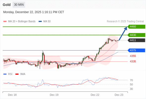 在 4375 之上,看涨,目标价位为 4430 ,然后为 4460 。
