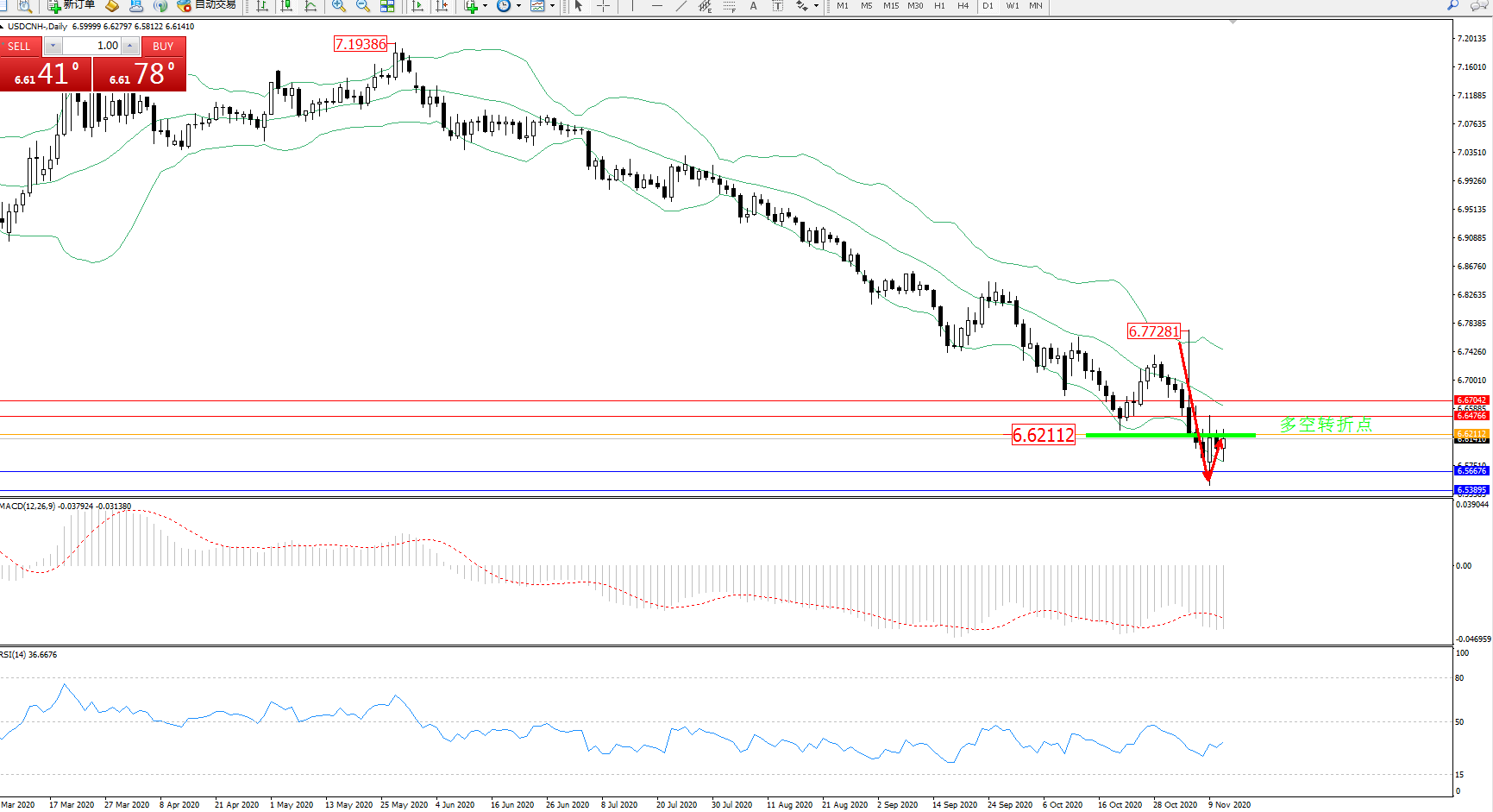 美元人民币USDCNH——日K线图显示: