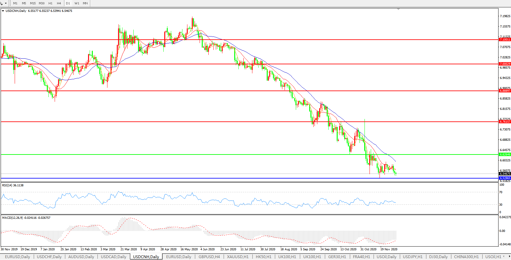 美元兑人民币USDCNH 日线图: