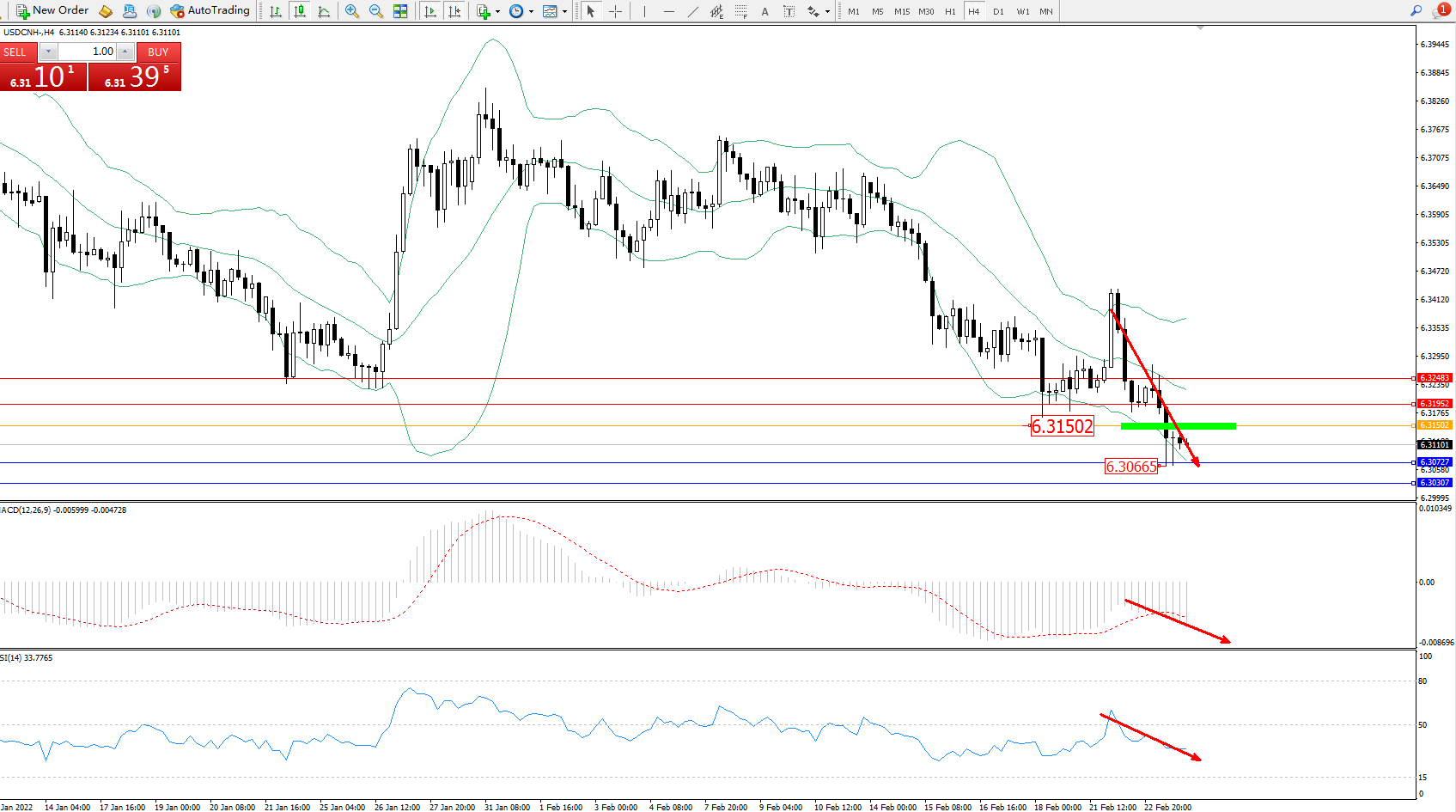 美元人民币USDCNH——4小时K线图显示: