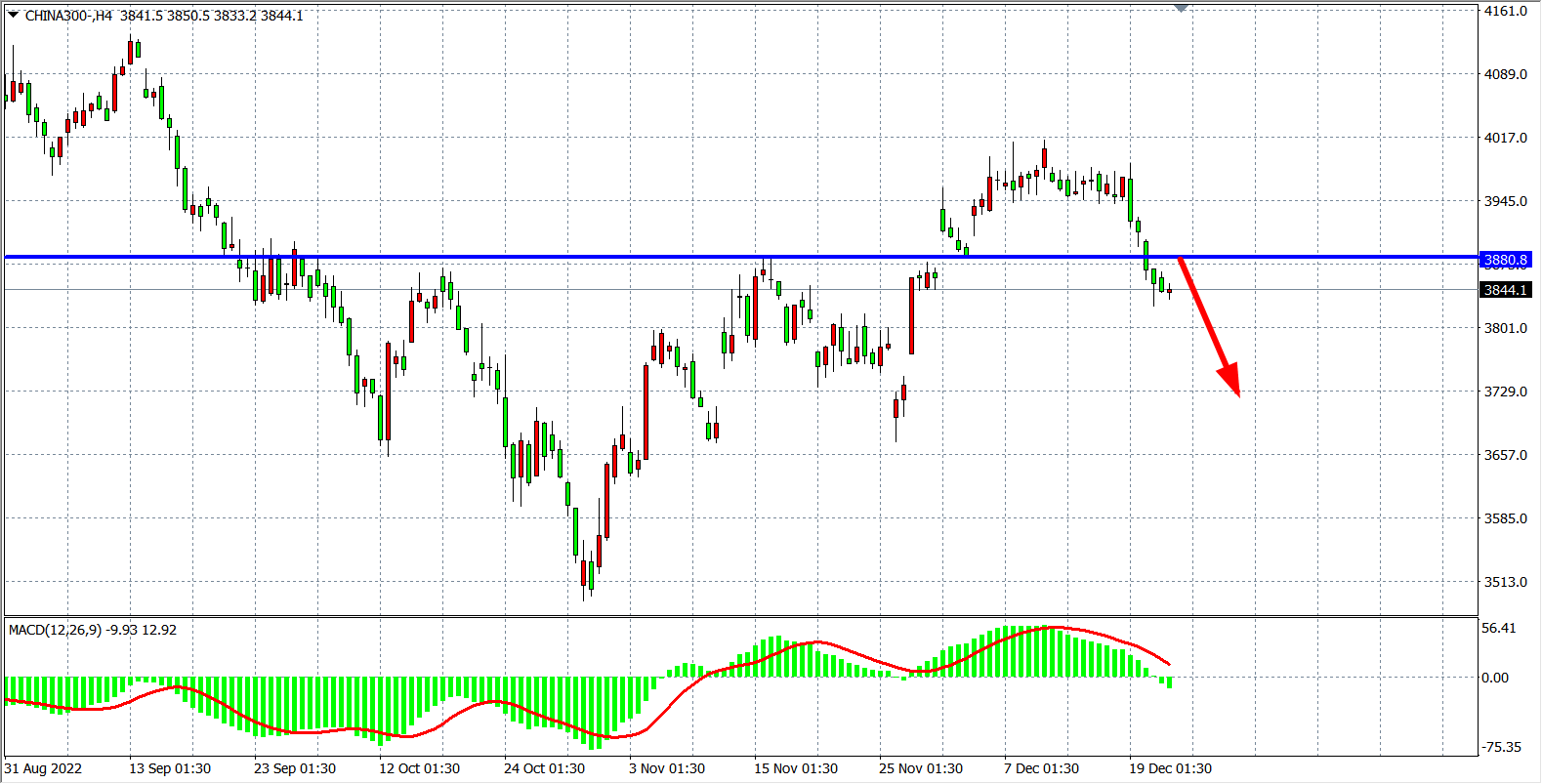4小时图看,沪深300在3900之下维持跌势,趋势呈空头下行为主,MACD于零轴之下出现持续放量状态,显示行情进走势较弱,不排除进一步走空,当前阻力下移3880附近,在3880之下看空为主,下方看3800-3750附近。