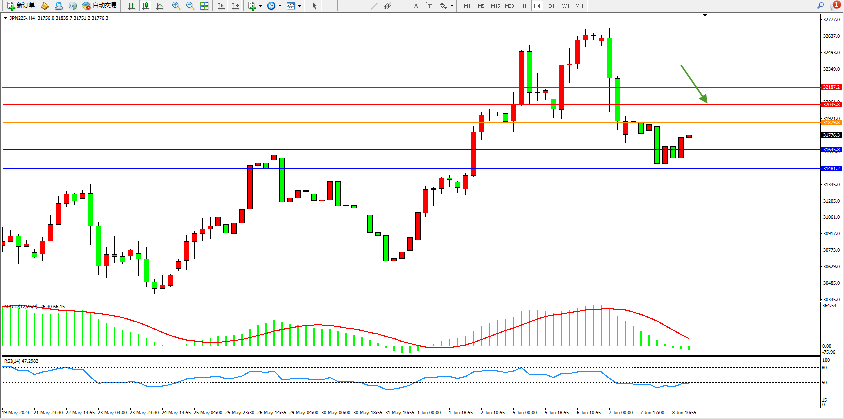 日经225指数6月8日(周四)收盘下跌268.74点,跌幅0.84%,报31645.00点。市场人士指出,日本没有实质的利空消息,也没有看到有资金高价接盘,获利了结的卖方资金力量强于市场承接的买方资金力量导致本日下跌。