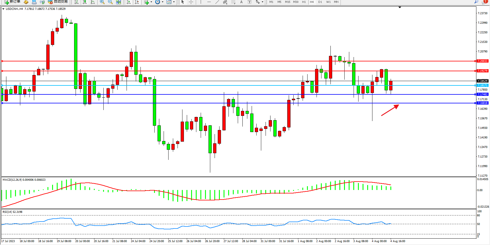 美元人民币USDCNH——4小时K线图显示: