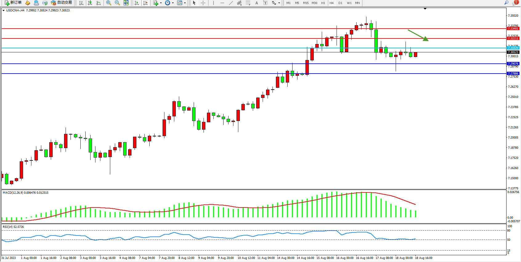 美元人民币USDCNH——4小时K线图显示: