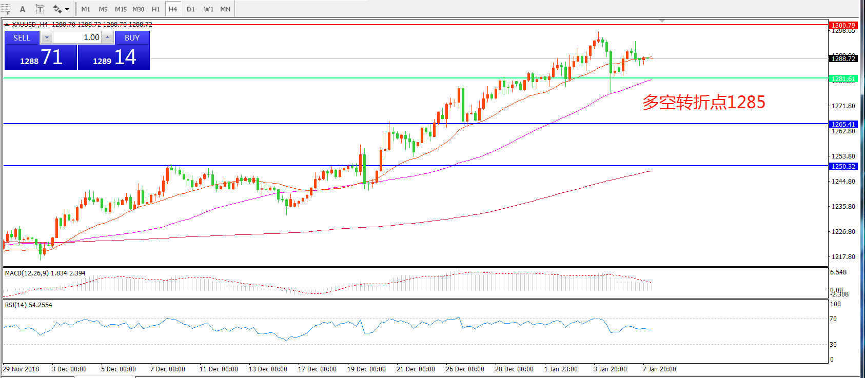 4小时图看,黄金站稳1285后强势上行,遇阻回落后陷入调整,均线呈现多头排列,短期仍是偏多思路。