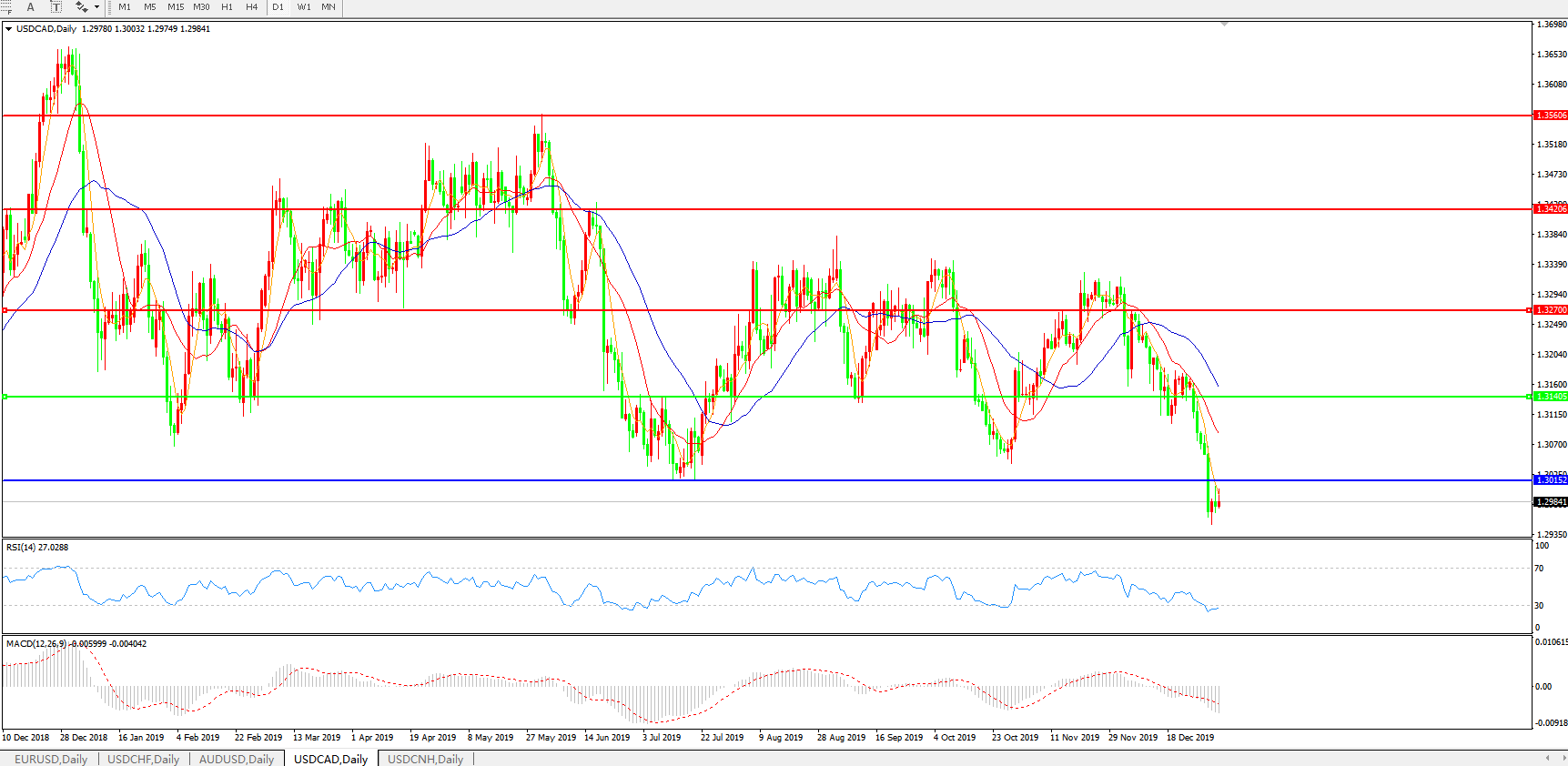 技术面简析:日线图均线呈空头排列,汇价跌破1.3140关口后保持弱势,MACD持续下行且量能加速放量,RSI震荡走低,预计汇价大概率将进一步下行。