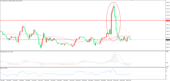 4小时图看,金价高位震荡后冲高回落,200周期均线成为新的阻力,1750成为下方支撑, MACD红柱缩短,RSI指标走平,日内延续震荡概率较大。